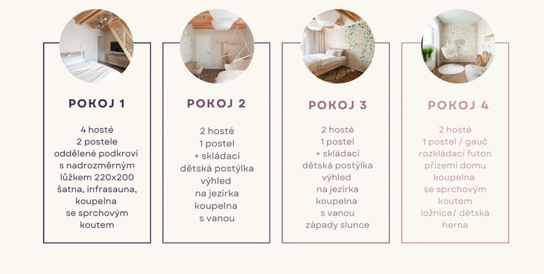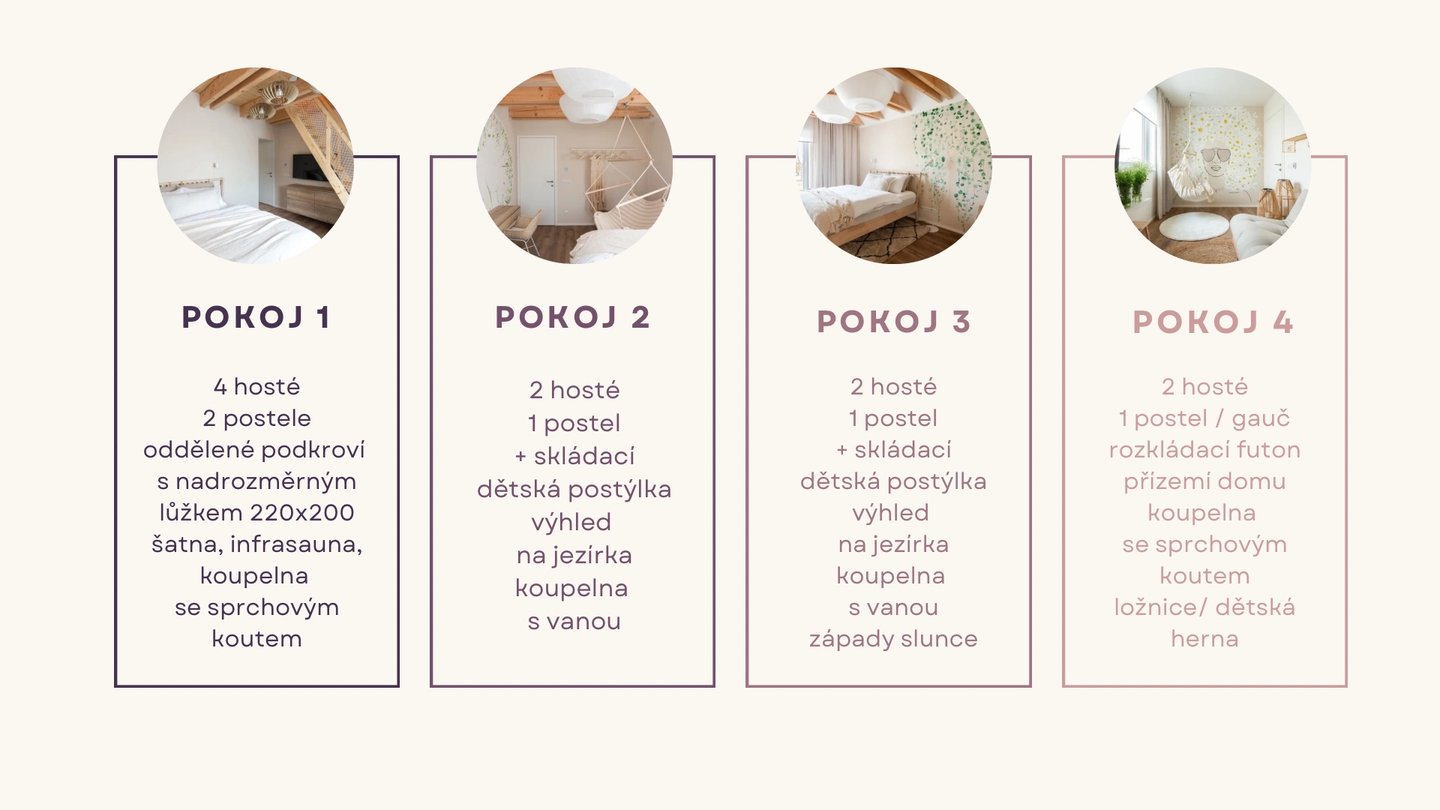 V patře domu jsou umístěny dvě koupelny a celkem 3 Feng Shui ložnice pro 9 osob. První dvě ložnice skýtají výhledy na přírodní jezírka před domem. Třetí ložnice je koncipována pro jednu rodinu, nachází se v oddělené části domu s vlastní koupelnou. V každé koupelně je pro vás připravena španělská kosmetika La Chinata s olivovým olejem a fén.